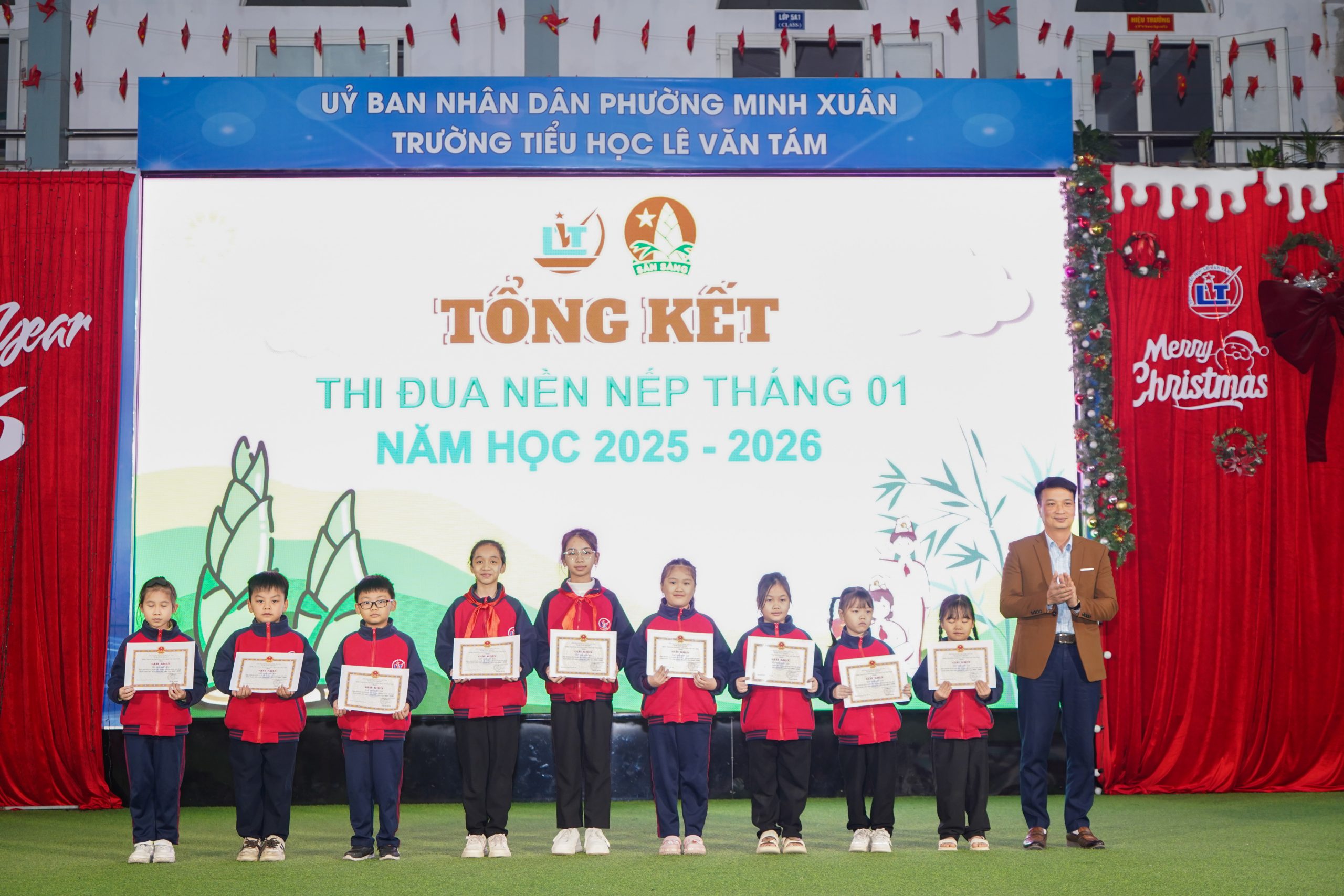 Cũng trong buổi sinh hoạt, Nhà trường đã tuyên dương và tặng giấy khen cho các tập thể lớp xuất sắc dẫn đầu phong trào thi đua nề nếp tháng 01/2026. Xin được chúc mừng các lớp: Khối 1: 1A1, 1A2, 1A3, 1A7 Khối 2: 2A4, 2A6 Khối 3: 3A1 Khối 4: 4A1 Khối 5: 5A1
